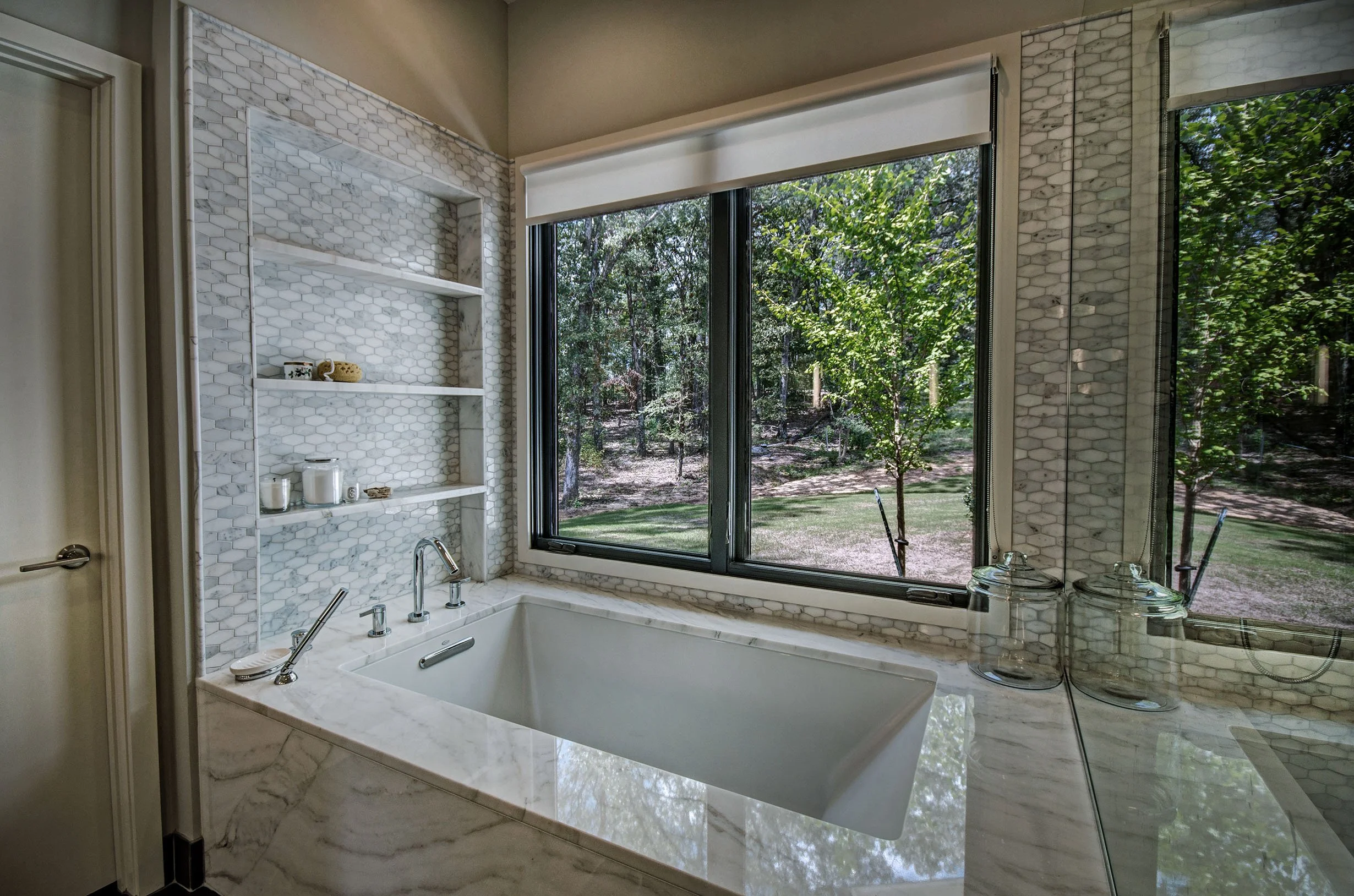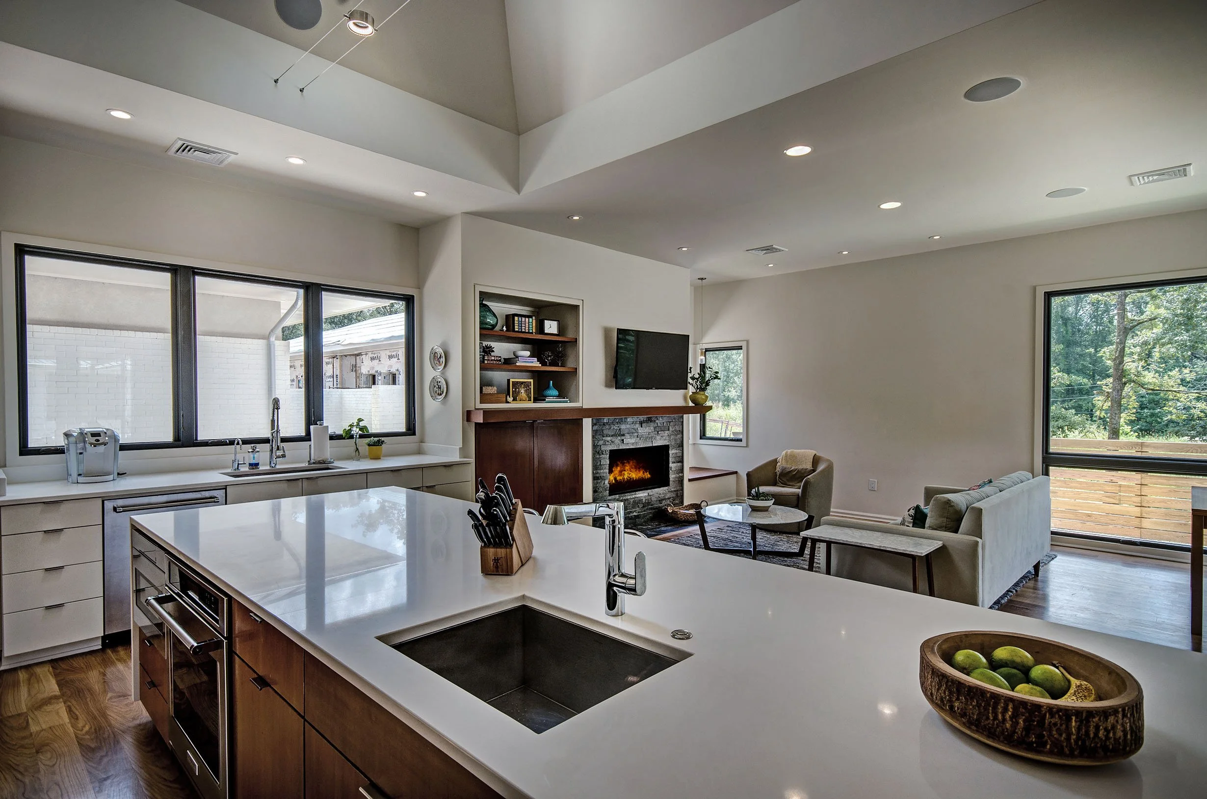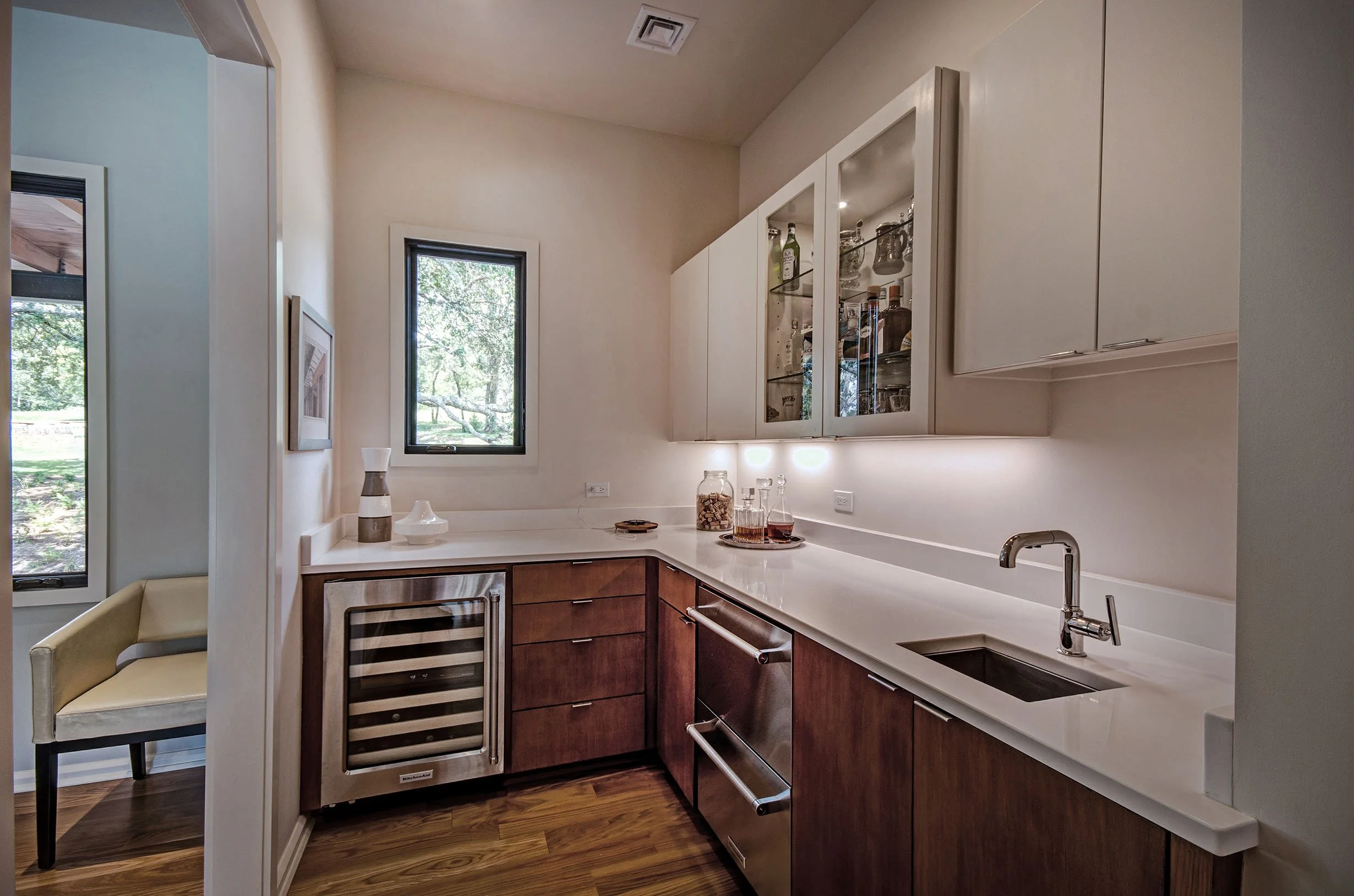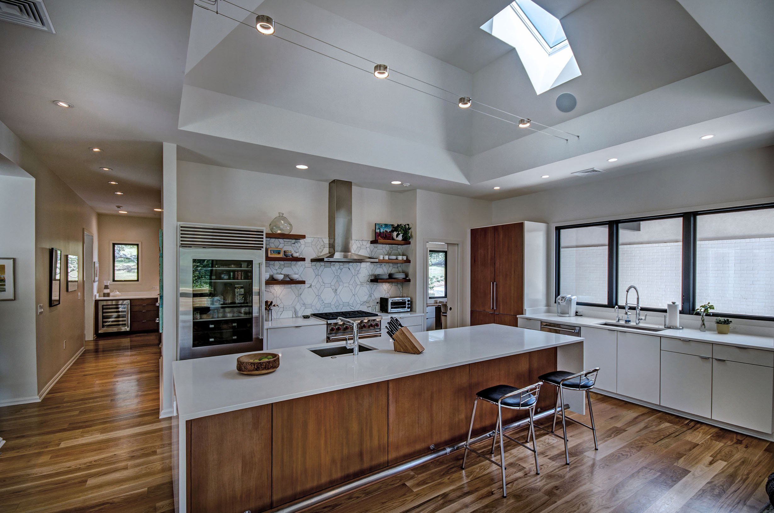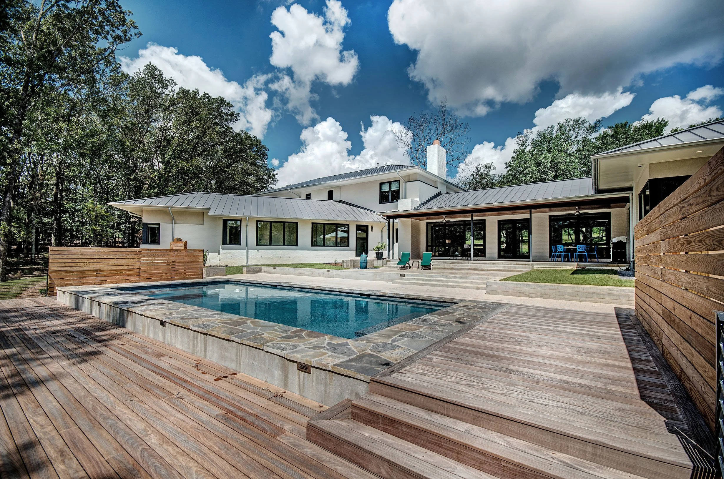 A new home designed in the classic American style of mid century modern settles on a wooded 5-acre rolling lot in Ridgeland. Over-sized windows, huge roof overhangs, and bright white stucco define the architecture. The house was designed as a compound consisting of the main house, a guest cottage, and workshop and garage. Breezeways and porches connect the structures and provide viewing of the pool and property. Rich wood tones, clean design lines, and the large windows give the interiors bright and give the interiors bright and open views, inviting the beautiful outside views in.